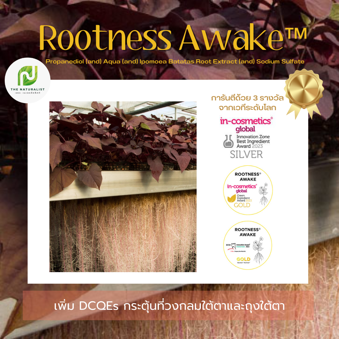 From USA  เป็นสารออกฤทธิ์จากธรรมชาติที่สกัดจากรากของ ipomoea batatas ด้วยเทคโนโลยี Plant Milking  โดย Rootness Awake อุดมไปด้วย DCQEs และกําหนดเป้าหมายกลไกหลายอย่างที่รับผิดชอบวงกลมใต้ตาและถุงใต้ตา
