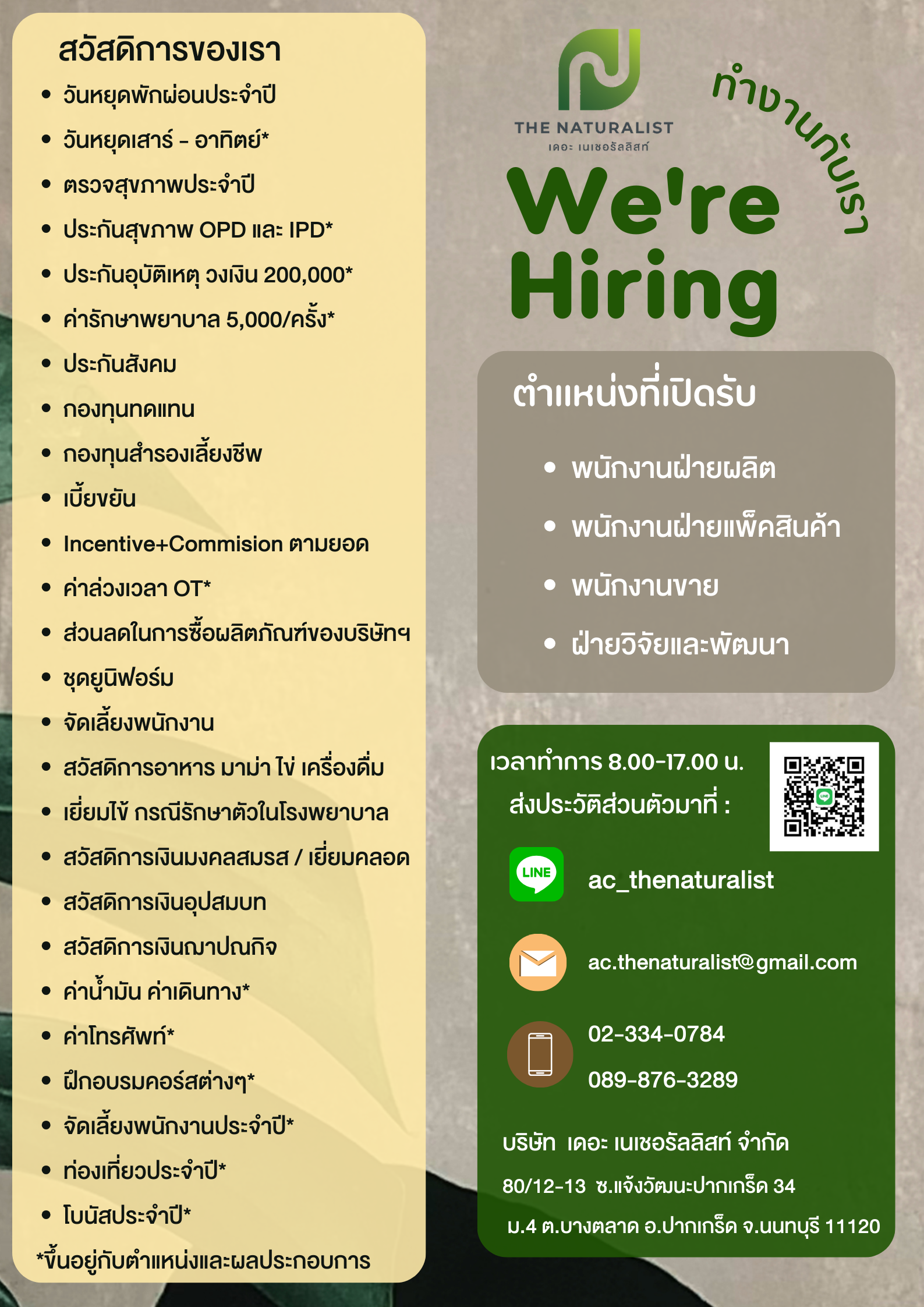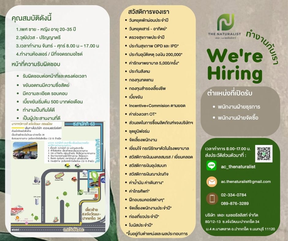 ติดต่อสมัครงาน หรือ ฝึกงาน : 089-876-3289E-mail : ac.thenaturalist@gmail.com Line ID : ac_thenaturalist